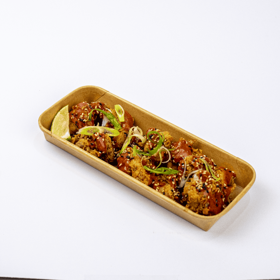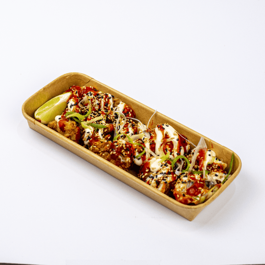 Deep-fried chicken with spicy mayo, red chilli, spring onion & sesame.